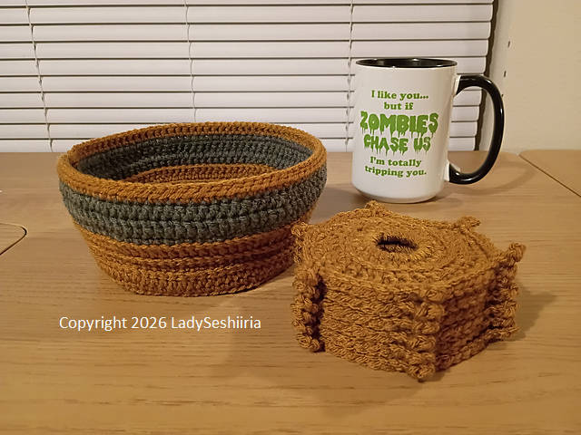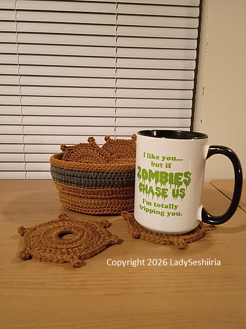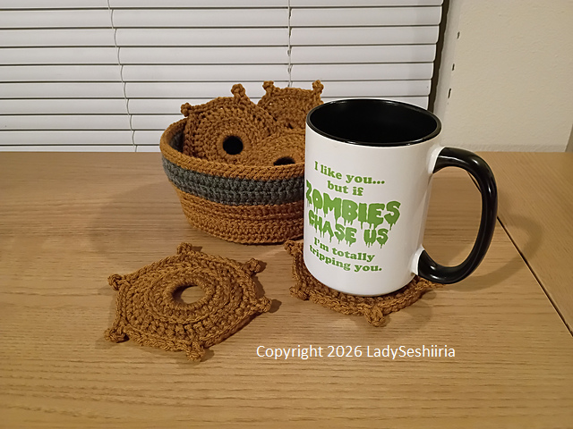 This pattern can be made with any sized hook and yarn weight and can be functional outside of a coaster caddy. The companion pattern is designed using the same stitch motifs used in my gear pattern to give it cohesion and consistency, and uses an invisible join frequently. If you do not know how to do this, there is an explanation within the pattern without images. If you need help there are tons of blogs or videos online as well. I don't plan on making this an instructional teaching blog, because it'll detract from my creative process. I thought about teaching at one time, and I am actually currently trail running it with a friend as I teach them to sew, but this isn't exactly something I want to do on a consistent basis.