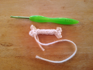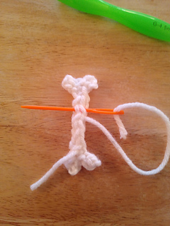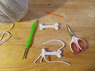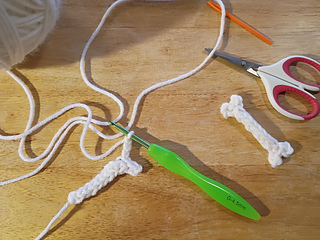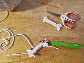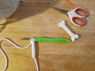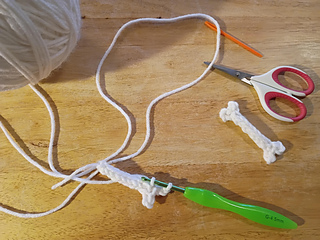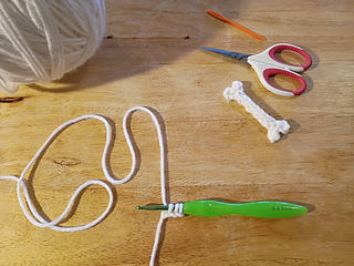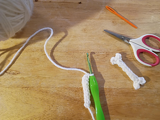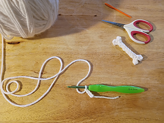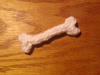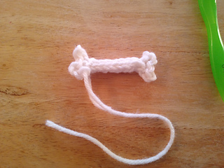 Tip: if you cut a long enough tail you can use it to f.o. and stitch up the back of the bone to the other end and crochet the other end.