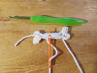 On the other end: Attach yarn to 1st ch stitch, ch3, sl st into 3rd ch from hook, sk-st, sl-st into 3rd ch st, ch3, sl-st into same base ch-sp, F.O.